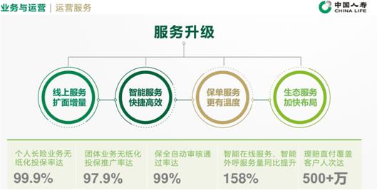 前端线上触点更便捷。在前端投保环节,中国人寿用寿险APP、微信小程序等串联起9000万用户、170万销售人员、160余项服务内容、咨询及产品,确保99%的保单服务可通过线上方式自助办理,实现客户一站式的服务体验。
